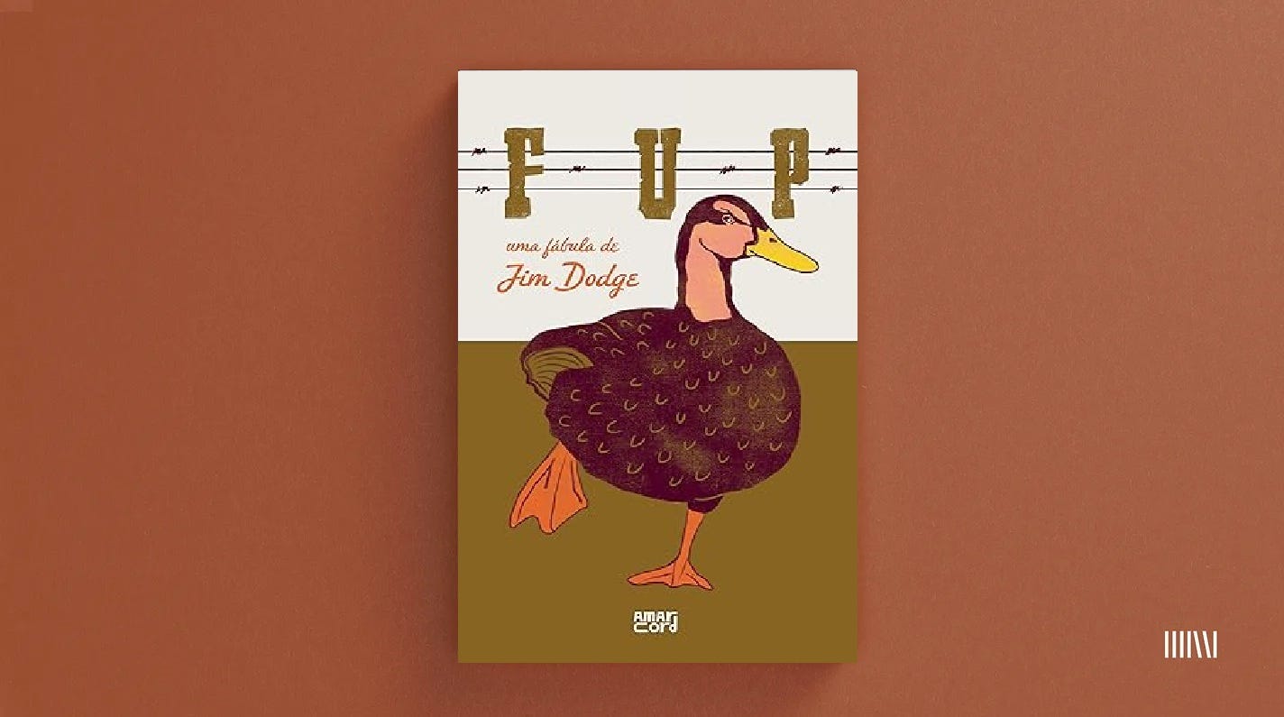 Já contei aqui que na “minha época”, não tinha esse lance de “young adult”. Quando a gente gabaritava a coleção Vagalume, dava um salto quântico de Um cadáver ouve rádio para o O estrangeiro. Pelo menos foi meu caso lá em casa, há mais de trinta anos. Lembro de percorrer a estante da minha mãe em busca de livros com a lombada fina, numa intuição equivocada & adolescente de que tamanho era documento, até encontrar esse Fup, fininho e satisfatório, com um pato na capa. Fup é a história de um velho bêbado, um jovem gigante e uma pata gorda — mas quanta coisa acontece aí. Narrado de um jeito meio fabular, com duzentos acontecimentos por página, parece um conto de fadas malandro, com porres fenomenais, pessoas absolutamente maravilhosas, ligeiramente mágico (daquela mágica que só um porre desbragado é capaz de convencer) e um tipo de épico humano, sincero e safado. Reli há pouco, porque tem uma edição linda nova aqui da Record (disclaimer: onde trabalho atualmente, já avisei) e achei impressionante como eu me lembrava das cenas, das personagens, das presepadas. Mas foi meio surpresa descobrir as frases monumentais, a sabedoria fresca de quem sabe que a coisa mais bonita do mundo é gente e a beleza espantosa da relação entre os três, porque profundamente calcada nas diferenças, ao mesmo tempo em que encontra um fundo de afeto firme com as cercas que Miúdo, o neto gigante, constrói. Li em umas três horas, e com certeza vou levar pelos próximos trinta anos.